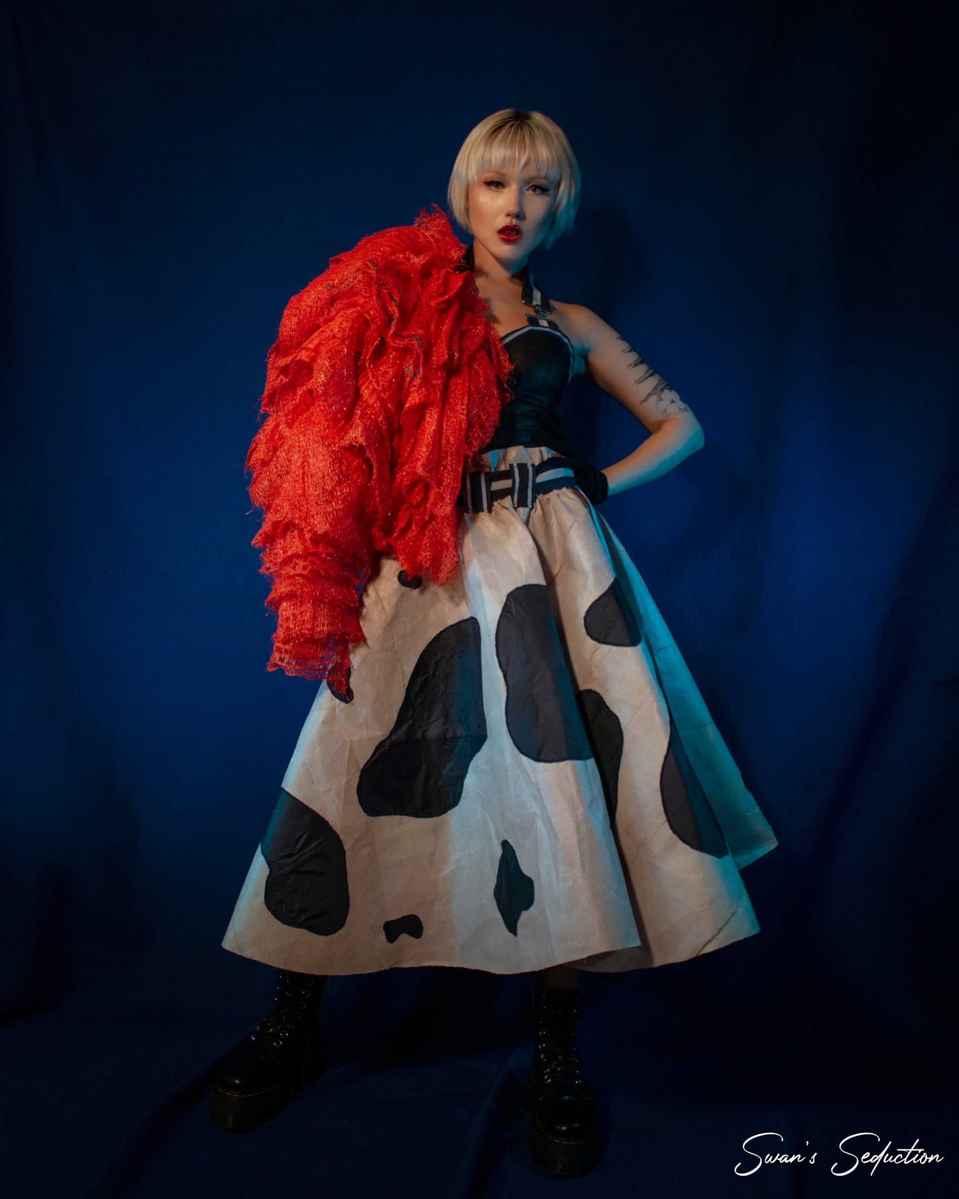 Jacket made from upcycled carrot bags on a cotton base. This design was part of the Sexy Farm Collection. Perfect for photoshoots, themed events or stage moments that call for unapologetic character and contrast.