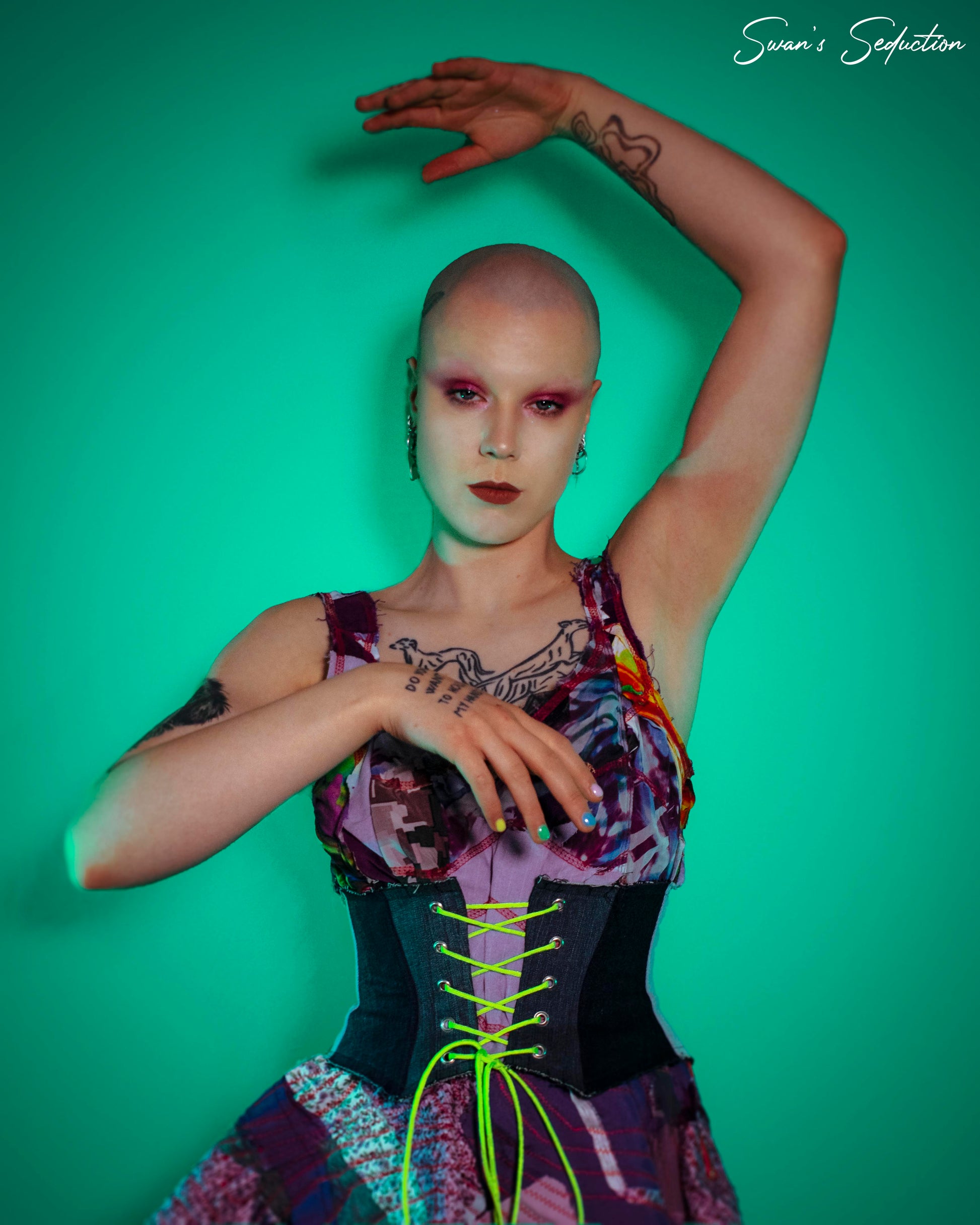 This one of a kind denim corset style design is part of the Leftover Lover collection. This design is made from different denim fabric scraps combined with a neon green, pink or blue lace. Keep in mind that this design is not meant to cinch in the waist.