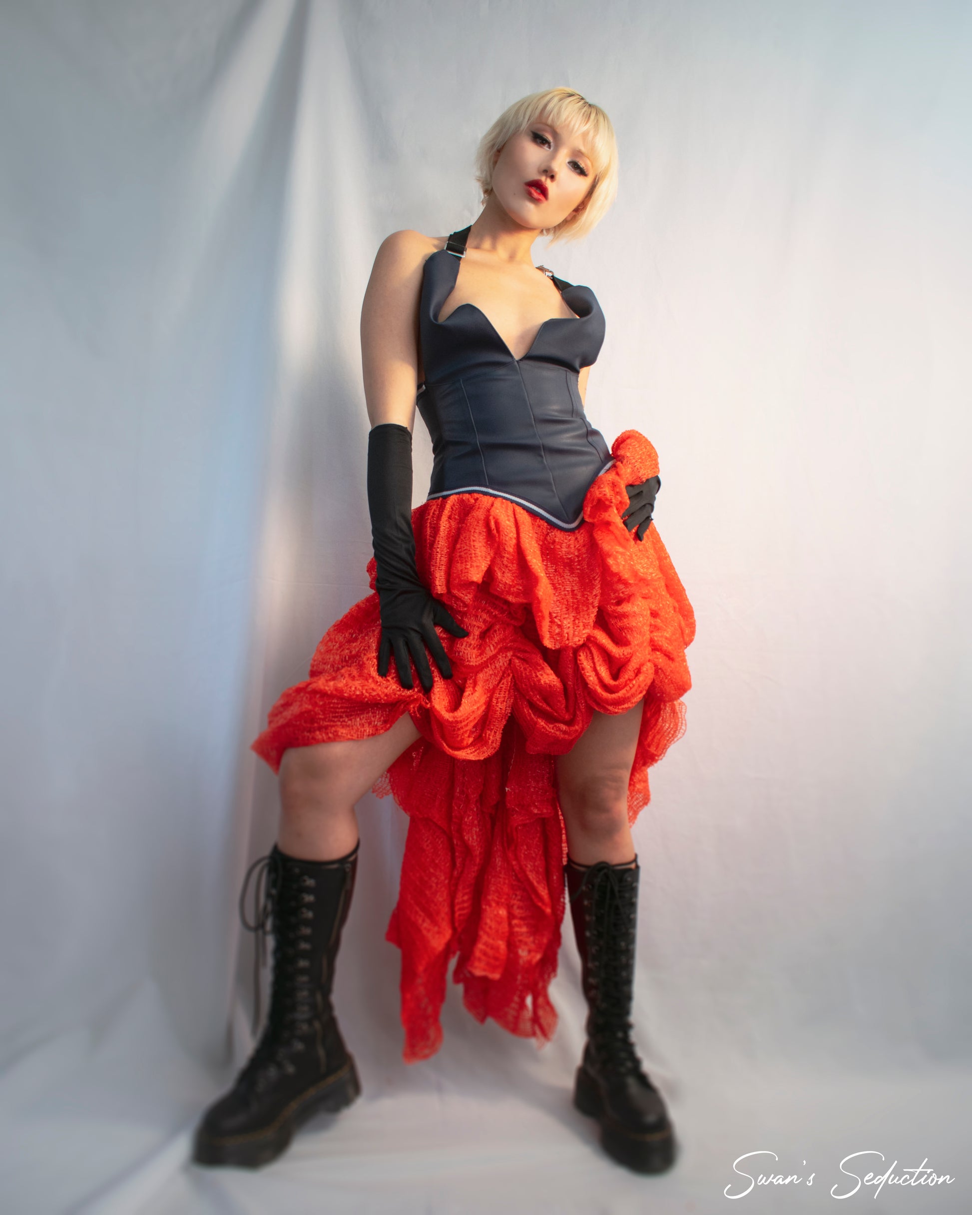 This one-of-a-kind outfit fuses sensuality and sustainability in a bold, body-celebrating silhouette. Made to be noticed — from photo studio to stage.